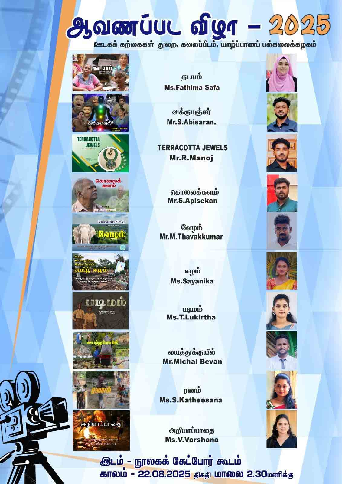 யாழ்., பல்கலைக்கழக மாணவர்களின் 10 ஆவணப்படங்கள் இன்று திரையிடப்படும் யாழ்ப்பாணப் பல்கலைக்கழக ஊடகக் கற்கைகள் துறை மாணவர்களால் தயாரிக்கப்பட்ட ஆவணப்படங்கள் வெள்ளிக்கிழமை பிற்பகல் 2.30 மணிக்கு பல்கலைக்கழக நூலகக் கேட்போர்கூடத்தில் திரையிடப்படவுள்ளன. Pages: Page 1, Page 2