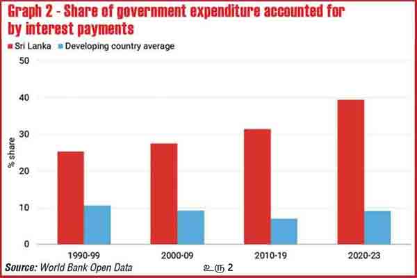 ஆயினும், இதிலும், அதன் பின்விளைவுகளை எதிர்கொள்வதிலிருந்து பின்வாங்குவதாக இந்த முன்மொழிவு அமைந்துள்ளது. முதலாவதாக, உத்தேசிக்கப்பட்டுள்ள மேலதிக செலவினங்களின் அளவுக்கான நியாயப்பாடுகள் மிகக் குறைவாகவே வழங்கப்பட்டுள்ளன (சர்வதேச நாணய நிதியத்தின் மதிப்பீடுகளை ஏற்றுக்கொள்வதைத் தவிர). முக்கியமாக, இந்த அதிகரித்த செலவினங்களுக்கு எவ்வாறு நிதியளிக்கப்படும் என்பது குறித்த தெளிவான விளக்கம் இல்லை. புதிய மத்திய வங்கிச் சட்டத்தினால் விதிக்கப்பட்டுள்ள பணவியல் மற்றும் நிதிசார் கட்டுப்பாடுகள் குறித்து மௌனம் காப்பதன் மூலம், இந்த முன்மொழிவானது அதிகரித்த பற்றாக்குறை நிதி வழங்கல் உள்நாட்டு வர்த்தக மூலங்களிலிருந்தே பெறப்படும் என்பதை மறைமுகமாக ஏற்றுக்கொள்கிறது. இது அரசாங்கத்தின் ஏற்கனவே பாரிய அளவில் உள்ள உள்ளூர் நாணயக் கடன் சுமையை மேலும் அதிகரிப்பதுடன், நடைமுறை வட்டி விகிதங்களை உயர்ந்த மட்டத்திலேயே வைத்திருக்கும் (உருப்படம் 2 ஐப் பார்க்கவும்). சலுகை அடிப்படையிலான நிதியளிப்பு அல்லது கடன் நிவாரணம் கிடைக்காத பட்சத்தில், கூடுதல் நிதிசார் நெகிழ்வுத்தன்மை என்பது பேரிடர் தொடர்பான செலவினங்களை நிரந்தரமான உயர் கடன்-வட்டி சுமைகளுக்குள் சிக்க வைத்துவிடும். இது இலங்கையை நிலையற்ற உலகளாவிய சந்தைகளுக்கும், உள்நாட்டில் அதிக செலவுடைய சந்தை-சார்ந்த கடன் பொறியினுளும் தள்ளிவிடும்.